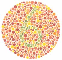 There are a wide variety of tests for abnormal color vision. Most were designed for industrial purposes, to help identify workers that might have a problem performing certain identification and sorting tasks. One of the most widely recognized is used below. Note, however,that the reproduction of these figures is not precise and the surrounding light level is not well controlled. If you fail this test, you might want to talk to an optometrist before jumping to any conclusion.